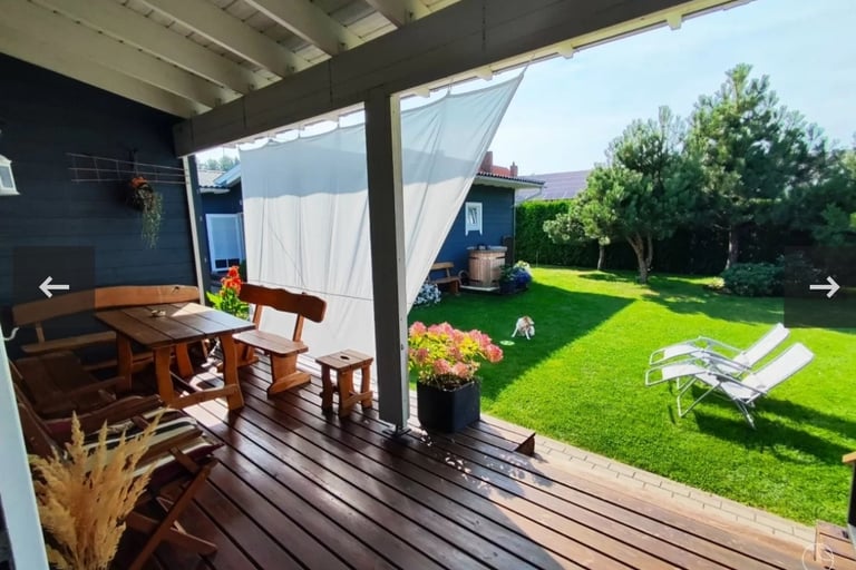 Sodyboje prie jūros, gyvensime 4 skirtinguose skandinaviško tipo nameliuose ( atskirai ) čia turėsite savo terasą, erdvę.